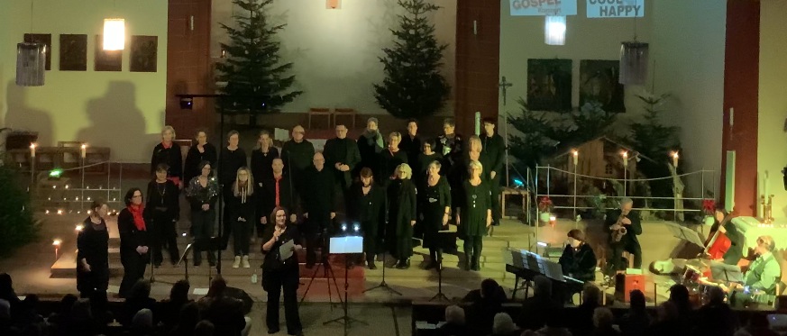 - Zu unserem Konzert unter dem Motto „That‘s why we sing“ hatten wir, der Gospelchor Cool and Happy, am 25. Januar in die katholische Kirche nach Pfinztal/ Wöschbach eingeladen. Zu unserer großen Freude war die Kirche kurz vor Beginn voll besetzt. Mit unserem Programm aus bekannten und neuen Gospels, mit und ohne Solisten, und begleitet von unserer Band – am Klavier Anna Stanimak, am Saxophon Bernd Merz, am Cello Christina Hirsch und am Schlagzeug/ Cajon Ritchie Kovac – konnten wir die Besucherinnen und Besucher begeistern und zum Mitsingen bewegen. So ergab sich ein klangvolles, bewegendes Konzert. Wir sagen ganz herzlichen Dank für Ihren Besuch, Ihr Mitwirken, Ihren Beifall und Ihre Spenden.